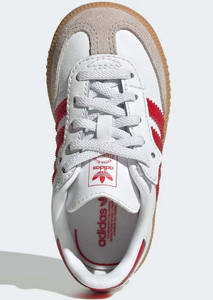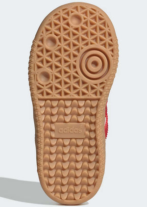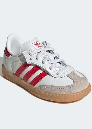 The adidas Samba is a true representation of 3-Stripes style. It's kicked its way from soccer pitches to skate parks since the 1950s, collecting a cohort of fans along the way. These infants' shoes bring back the glory of the original Samba. The smooth leather upper, suede toe cap and serrated 3-Stripes are all here, along with stretch laces that make them easy to slip on and off. The soft lining and flexible rubber outsole are tuned for growing feet.