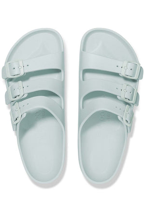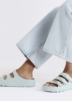 Modeled on the cork original, this sandal is made from especially light and highly flexible EVA. This high-quality, odor-neutral synthetic material which has been tested for harmful substances is shock-absorbent, water-resistant, and skin-friendly. It is therefore perfect for wearing on the beach, in the garden, or in wellness and spa areas.