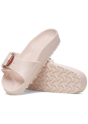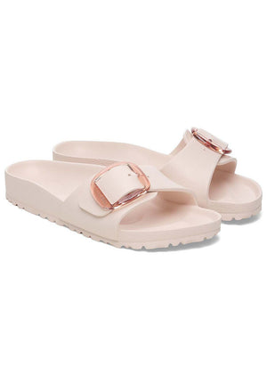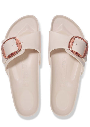 This is a new and modern interpretation of the BIRKENSTOCK classic Madrid. This version features our popular Big Buckle made from a stainless synthetic material and makes an impression with its durability and minimalist design. Modeled on the cork sandal, it is made from the ultra-lightweight and highly flexible synthetic material EVA. The high-quality, odor-neutral EVA has been tested for harmful substances and combines numerous positive attributes: it is very light, highly elastic, shock-absorbent, water-resistant, and skin-friendly.