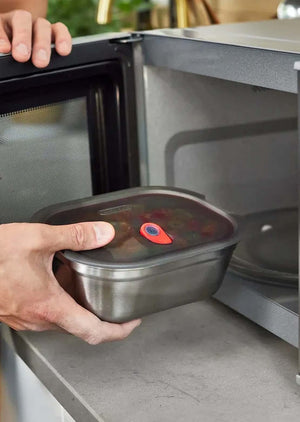 Our first 3-in-1 microwaveable stainless steel lunch box: 100% multifunctional lunch box, oven dish and food preserver. Made from durable stainless steel and polypropylene. Vacuum seal for 100% airtight storage. Oven and freezer safe.