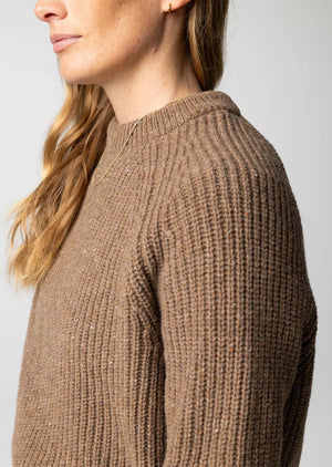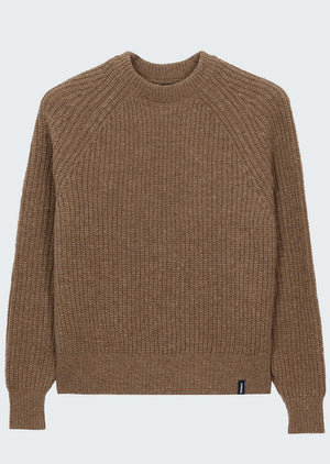 The Mora women's merino wool sweater is a feminine take on a traditional fisherman knit. Available here in earth brown. Now in 100% merino, improving quality and sustainability, the Mora is knitted from wool yarn with subtle coloured flecks and fashioning detail for a modern finish, it keeps you warm without feeling too bulky or heavy.