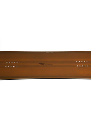 The GENTEMSTICK’s radical Accel camber eliminates hooking and prevents nosedives in deep powder or fresh snow, while maintaining a natural floatation. It is designed and shaped to perform its best when the rider stands neutrally on top of a board. It is made flat from the widest point of the nose side to about the front foot. The arch begins there and reaches the highest around the back foot, and it ends at the widest point of the tail side. When a rider stands on the board, the arch gets pushed and the area ahead of the front foot barely touches the snow.