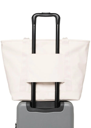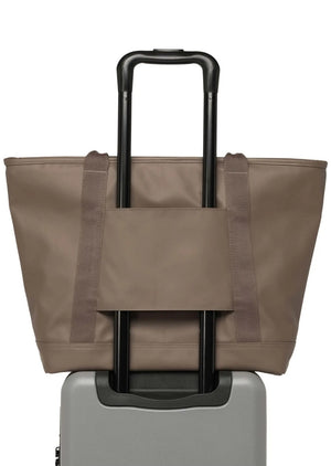 We know rain. Constructed with a matte coating, the Alberni Tote is inspired by rainy commutes in Vancouver, BC. It is designed to fit everything you need. It features a zippered front pocket, spacious main compartment, internal pockets and a storage sleeve for your water bottle. For longer trips, attach it to your luggage using the zippered trolley sleeve.