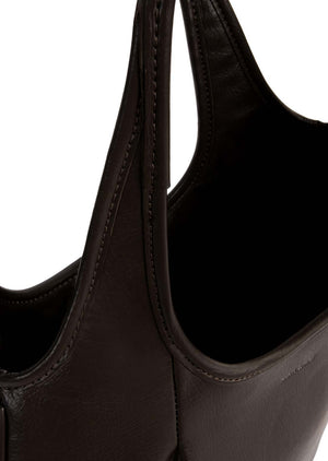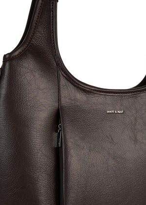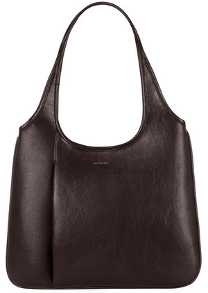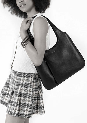 A slim hobo-style tote with skinny handles, a magnetic snap closure, and a hidden zippered pocket on the front.