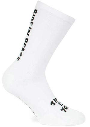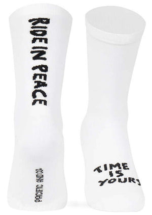 Designed for cyclists looking for comfort, a precise fit, and an extra touch of personality on the bike. Made with a second-skin fit and graduated compression, they feature reinforced heel and toe to withstand long rides. On the back, the message RIDE IN PEACE and on the instep TIME IS YOURS complete the design.