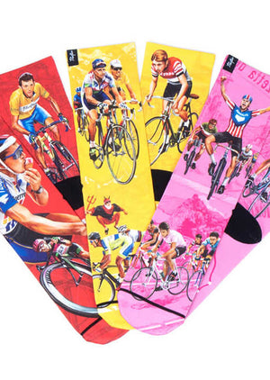 On the VUELTA 1935 socks we pay tribute to Roberto Heras, "The Spanish Climber", winner of the Vuelta a España 4 times. On the front, Federico Martín Bahamontes, two-time winner, appears next to Perico Delgado eating an ice cream, in reference to the famous anecdote of Bahamontes in La Romeyre.