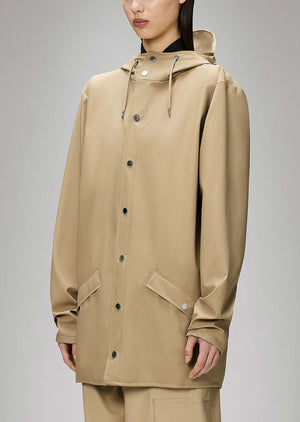 The design is easy-to-wear with an elegant drape. The unisex rain jacket is completed with under-arm eyelets and a back yoke with concealed vents for breathable comfort. Jacket is cut from Rains' signature PU fabric and features welded seams. The finish is lightweight with a smooth feel.