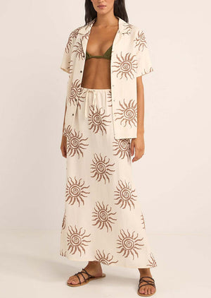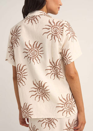 This Brown Seafarer Short Sleeve Shirt, made from a soft rayon-ramie blend, is a tribute to nautical ease. With a relaxed, boxy fit and a Cuban collar, it features a large-scale print that evokes the sprawling sea. Buttoned up or down, it's designed for those drawn to evenings overlooked by a warm horizon.