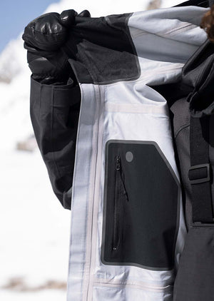 Interior stretch material built into garment for an additional snow barrier when getting pitted!