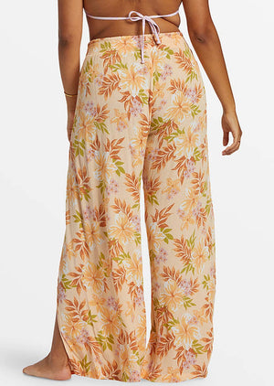 Ahh the Split Spirit Pants. A pants that takes in the trade winds, this vacation-inspired pair stands out with a dark floral print and split front leg. The high waist pant walks the line between covered and cool with high front slits and a drapey wide leg.