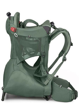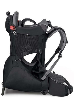 Full wrap aluminum tubing frame provides lightweight but stable heavy load carry. Collapsible foot bar provides greater maneuverability while the child carrier is on. Locking hinges and rotating side arms allow the frame to fold down for travel and storage