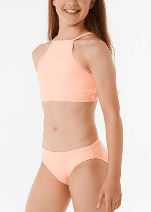 Elevate your little one's beach look with the Premium Rib Bikini. Made from ribbed Lycra for durability, this suit offers full coverage, chlorine-friendly fabric, and an alternative crop option. Ideal for girls aged 8 to 14 years.