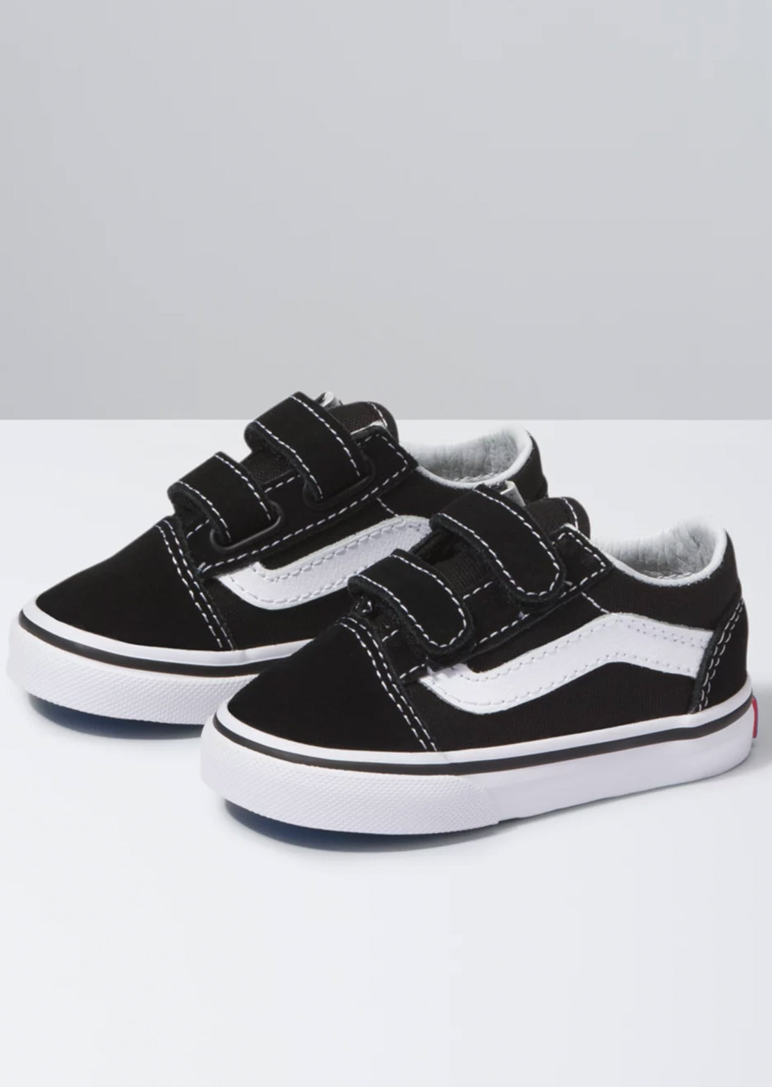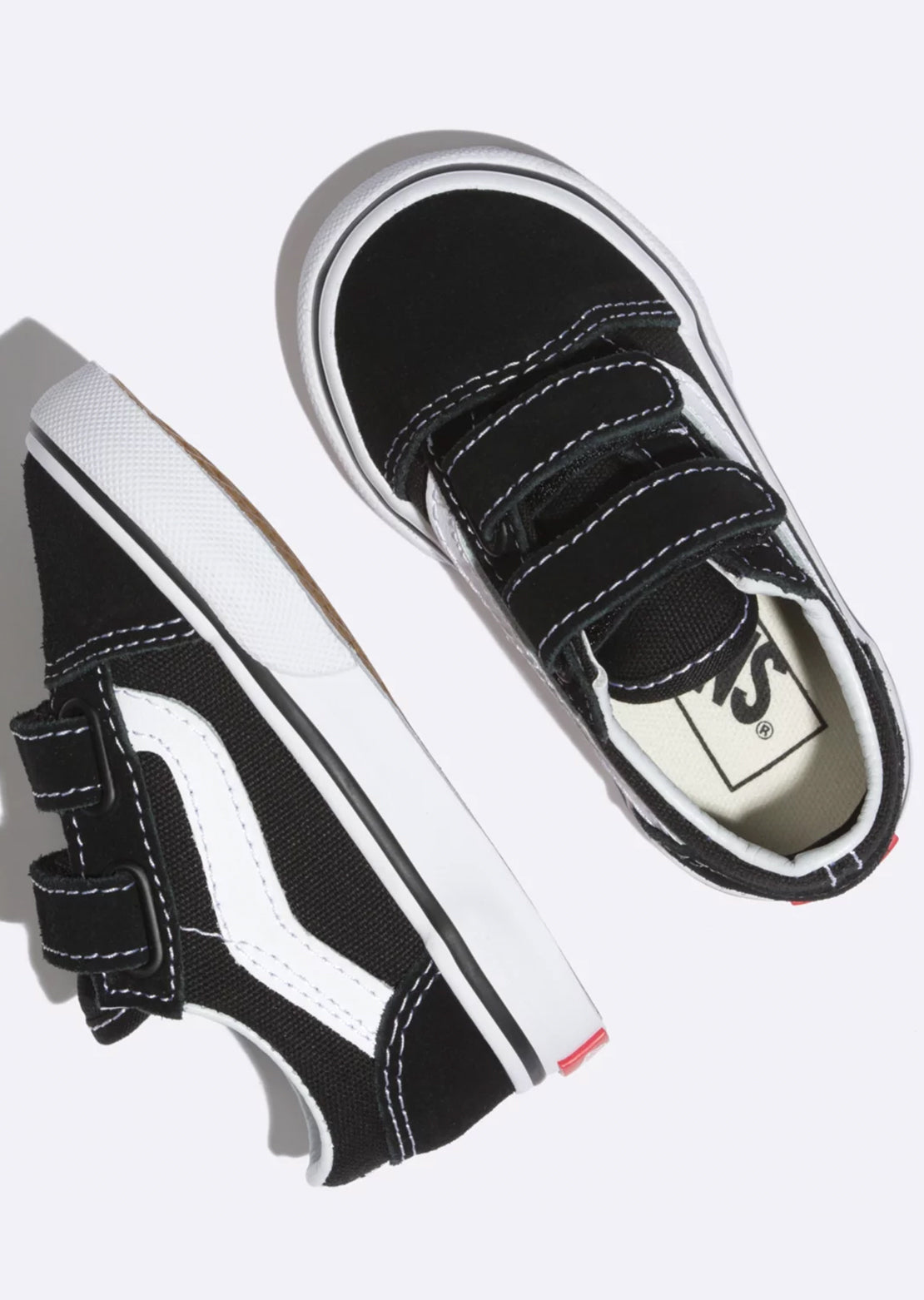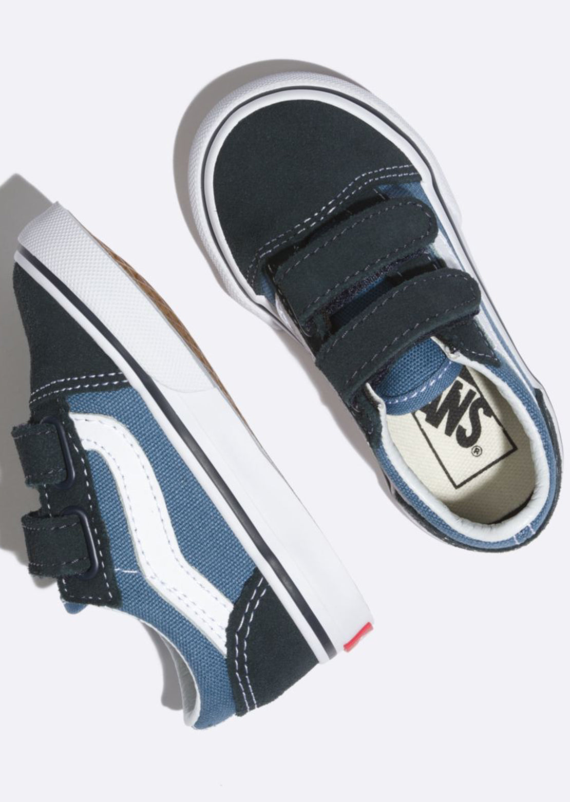 The Old Skool V, inspired by the classic Vans skate shoe, features a low profile silhouette with sturdy canvas and suede uppers, hook-and-loop closures, padded collars for support and flexibility, and signature rubber waffle outsoles.