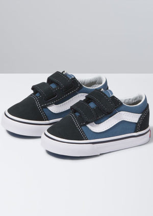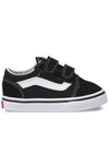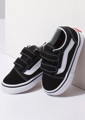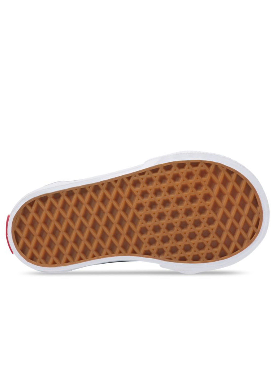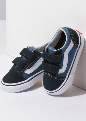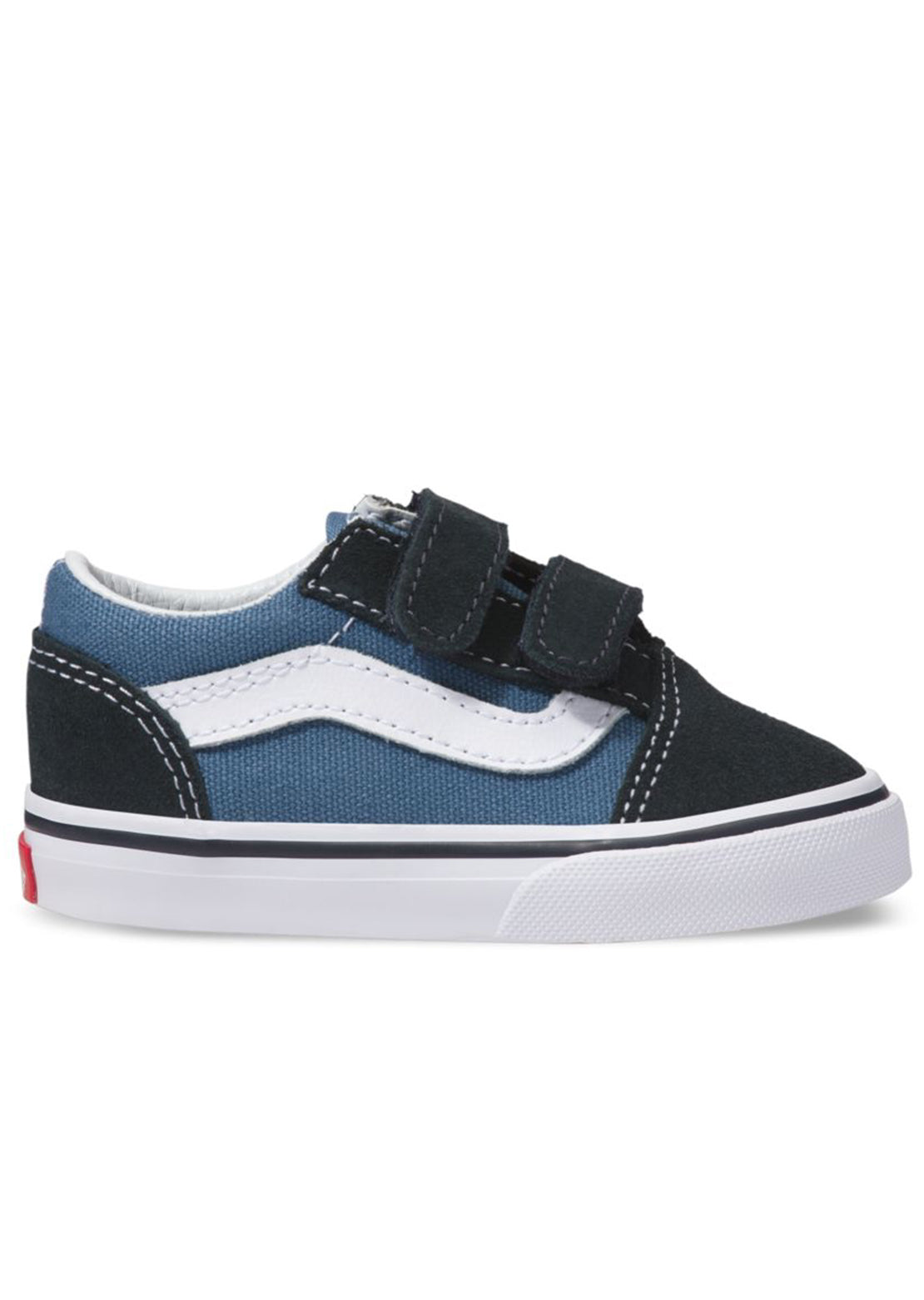 The Old Skool V, inspired by the classic Vans skate shoe, features a low profile silhouette with sturdy canvas and suede uppers, hook-and-loop closures, padded collars for support and flexibility, and signature rubber waffle outsoles.