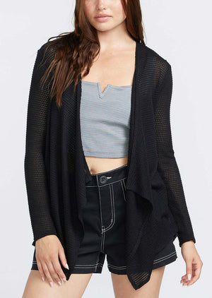 Your couch-to-corner store uniform, upgraded. Meet the Go Go Wrap from our Lived In Lounge collection: a textured pointelle, open-front wrap with fitted long sleeves and a waterfall drape that flatters without trying. In all-black, it pairs with anything, moves with you, and finishes with a subtle Stone clamp label for low-key cred.
